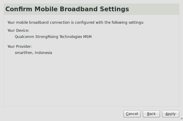 hal ini menandakan modem USB sudah siap digunakan sebagai modem USB. Langkah selanjutnya adalah melakukan koneksi dengan menggunakan Network Manager di panel sebelah bawah, lalu memilih Edit Connections >> pilih Mobile Broadband >> pilih Add